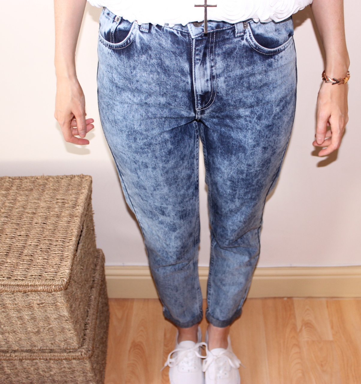 So I know this might not look very Spring but I think I’m almost there, do you? Recently the weather has just been so unpredictable (not uncommon for Glasgow to be honest!) so although I’ve been seeing loads of gorgeous Spring wear clothing, I’ve been putting off buying anything until the weather cheers up a bit! With that said, this is my take on an ‘almost Spring’ look as we were lucky enough to get some lovely weather on Saturday, yippeeee! I was out and about for most of the day so I wanted to be practical and comfy so opted for these new ‘Mom’ jeans I recently bought from Topshop. I really love acid wash jeans at the moment – I have the Topshop Leigh acid wash skinny jeans which are quite stretchy and soft, but the Mom jeans are proper jean material (if you know what I mean), quite thick with no stretch in them and are high waisted which I think are the most flattering style of jeans. I teamed these with my white 3D floral jumper and white Vans, with some simple gold/rose gold jewellery.